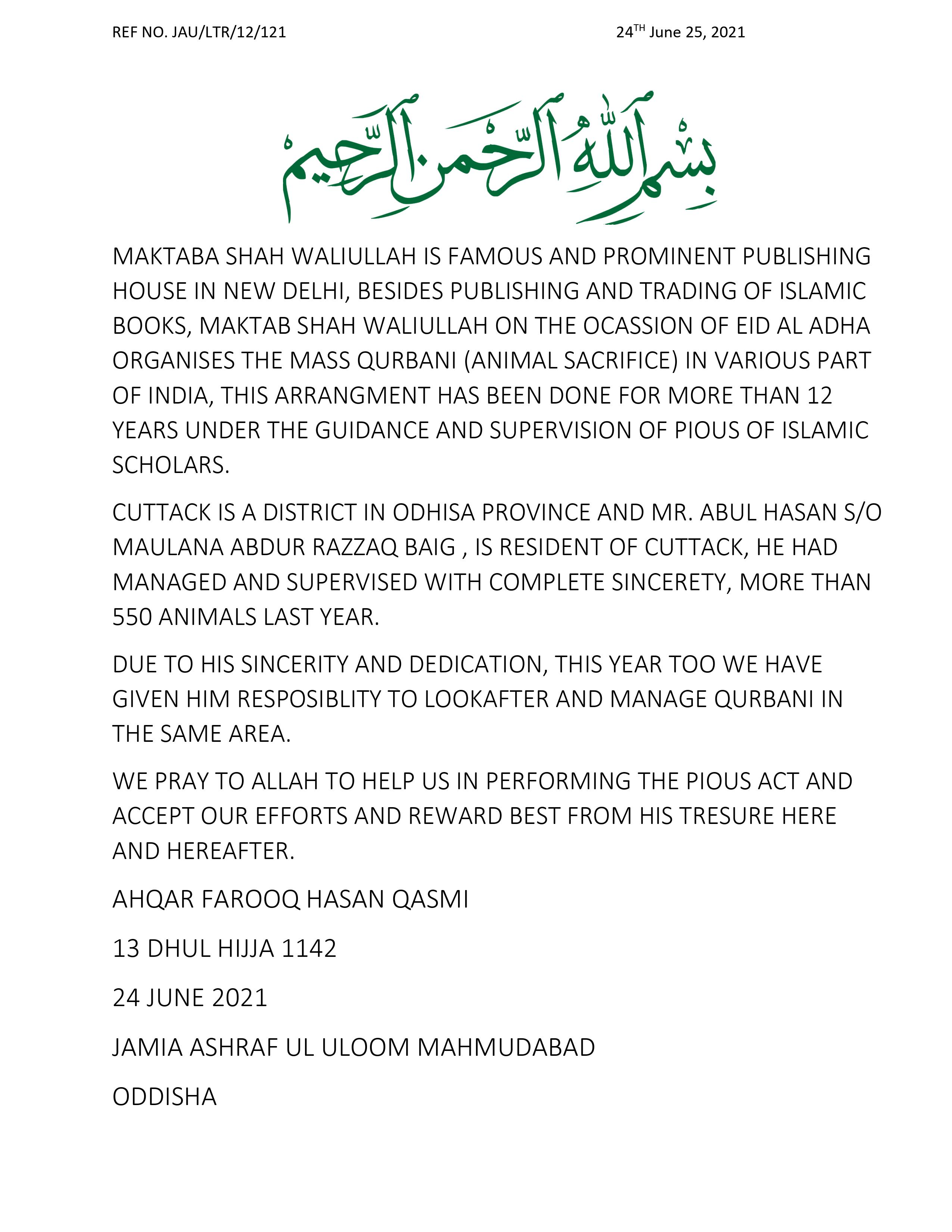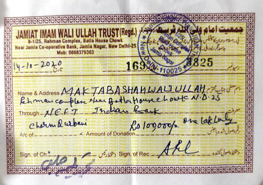 Under the Banner of Maktaba shah waliullah, this year too the pooled or Joint qurbani is being Organized . This pious act is performed in Delhi ,Orissa and various places in India under the guidance of Islamic Scholars as per sharia . Interested People can participate .